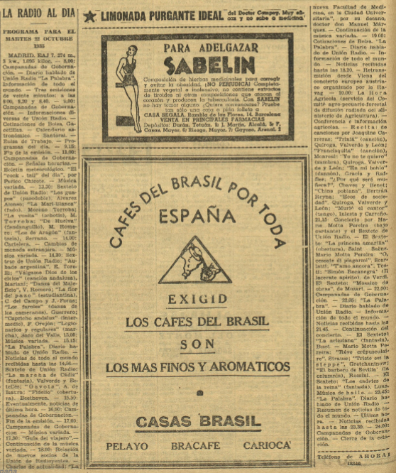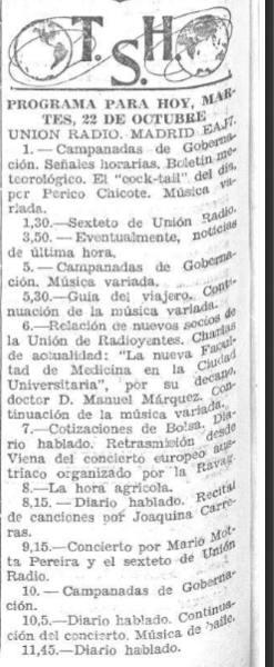 Ese mismo día intervendría en las ondas de Unión #Radio el decano de la Facultad de #Medicina de la Universidad Central, #ManuelMarquez, para informar de los avances en la construcción de la nueva facultad ubicada en la ciudad universitaria que se estaba edificando más allá del madrileño parque del Oeste. Su intervención tendría lugar a las seis de la tarde, antes de la emisión del programa "La hora agrícola" que emitía periódicamente esa emisora de radio, según consta en su programación insertada en las páginas de Ahora y El Sol.