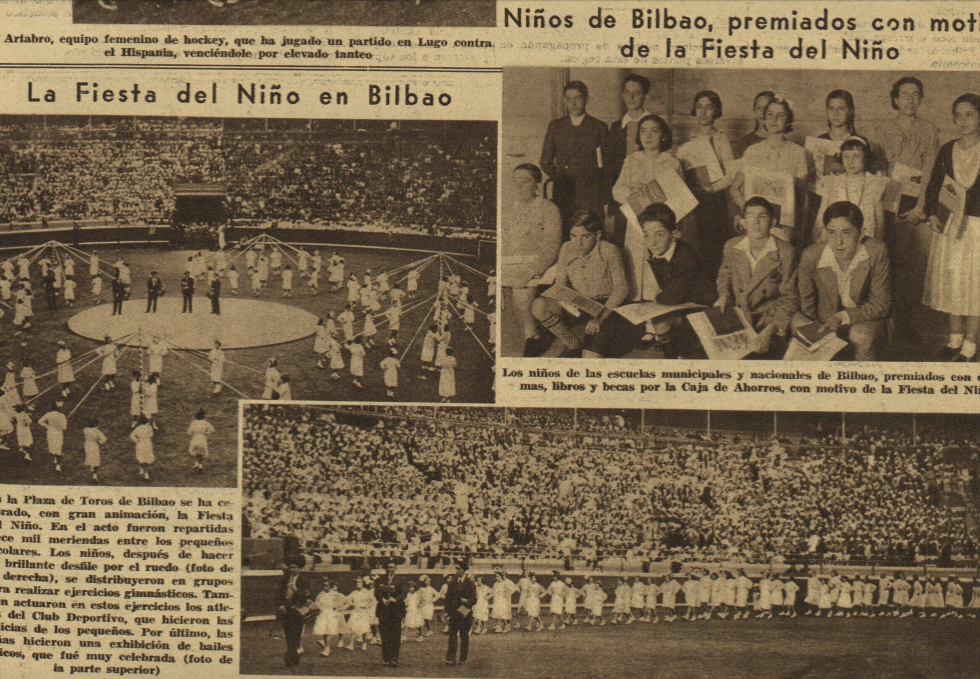Por su parte Ahora dio cobertura gráfica a la celebración multitudinaria en la plaza de toros de #Bilbao de la #fiesta del #niño, y El Liberal insertó un suelto sobre plazas vacantes existentes en la sección primaria del #InstitutoEscuela de Madrid, sección Retiro.