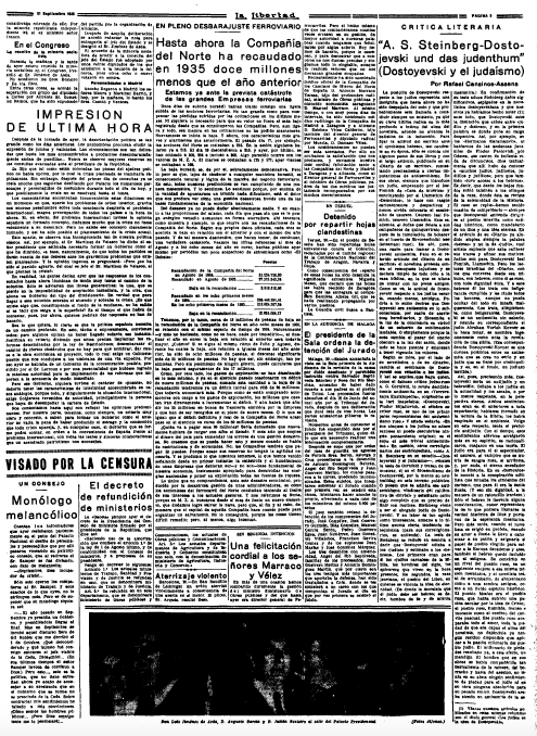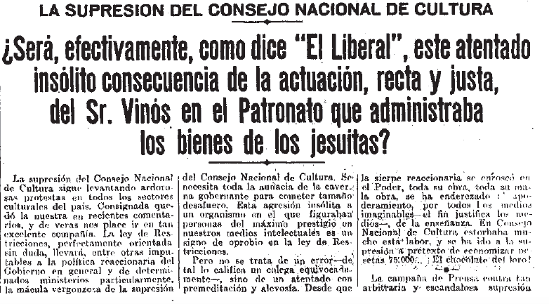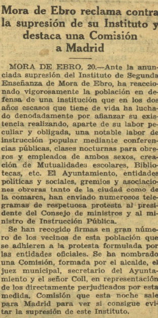 Ahora se hizo eco de las protestas suscitadas en #MoradeEbro con motivo de la supresión de su Instituto al aplicarse en ese centro la ley de restricciones. Y Heraldo de Madrid recogió informaciones extraídas de otros órganos de prensa que mostraron su disconformidad con la supresión del #ConsejoNacionaldeCultura.
