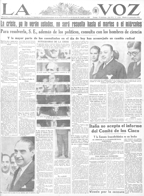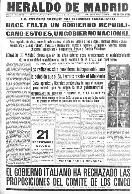Se ofrecen a continuación las portadas de seis diarios, editados en Madrid, correspondientes a ese día, cuatro matutinos -Ahora, El Sol, La Libertad y El Liberal- y dos vespertinos: Heraldo de Madrid y La Voz.