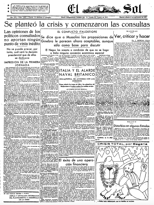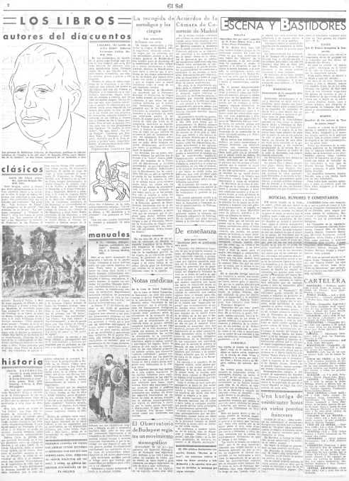 Además El Sol dedicó su página cultural a informar y hacer críticas de libros de #EugeniodOrs, de #BenedettoCroce sobre las relaciones hispano-italianas, y encomiar la publicación de obras de #LopedeVega por la #LibreríaBegua , de una nueva selección de #cuentos por la #editorialCalleja y un manual sobre #Etiopía o #Abisinia por la editorial gerundense #CarlesDalmauPla