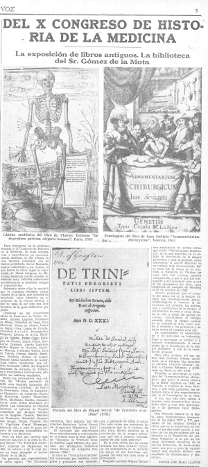 Por su parte La Voz insertó un artículo de #JoséMaríaLlopis sobre ese congreso en el que puso el énfasis en la exposición que se iba a llevar a cabo en el palacio del Senado de libros y objetos relacionados con la historia de la medicina, encomiando la riqueza de la biblioteca del sr. #GómezdelaMota, algunos de cuyos libros exponía a los lectores de ese diario, y que aquí mostramos también.