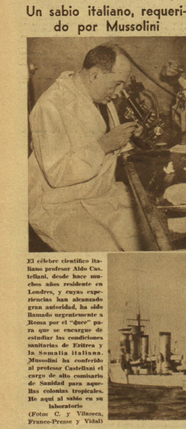 Y Ahora se hacía eco del llamamiento que había hecho #Mussolini al bacteriólogo y gran especialista en #medicinatropical #AldoCastellani para que se hiciese cargo de la organización de las condiciones sanitarias de #Eritrea y la #Somalia italiana en el marco de su imperialista política africana.