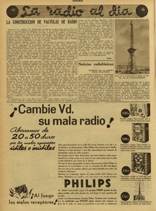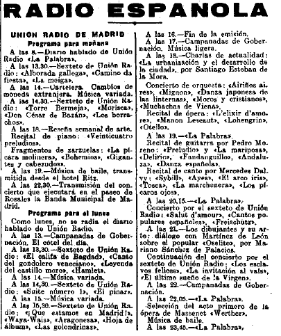 - informaciones sobre el uso de la radio en la sociedad española como la sección semanal del diario Ahora titulada "La radio al día" y la publicidad tomada del diario El Heraldo de Madrid de las emisiones de Unión Radio en la que se anunciaba la conferencia que daría en sus micrófonos el lunes 9 de septiembre el arquitecto SantiagoEstebandelaMora (1902-1988), que había tenido una beca en Londres en 1934, y que posteriormente desarrollaría una notable labor como urbanista en su exilio colombiano.