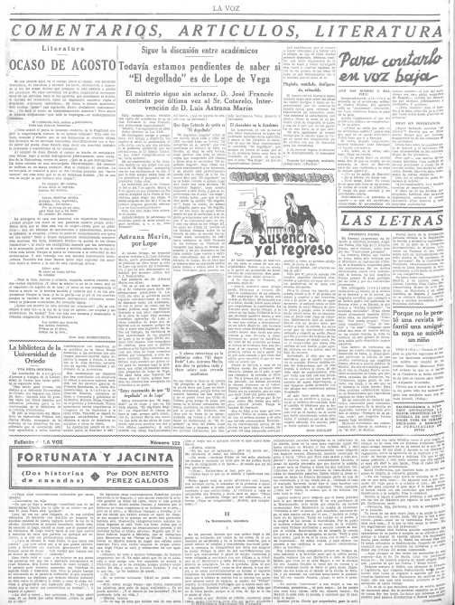 - noticias sobre el mundo de los libros procedentes de la página cultural del Heraldo de Madrid, de un anuncio publicitario de una empresa barcelonesa en ese mismo periódico y de otro anuncio en Ahora de la edición de diversas obras de #LopedeVega en la colección teatral La farsa dirigida al gran público.