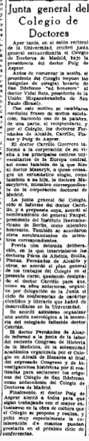 También El Sol dio cuenta de la celebración de una junta general del #ColegiodeDoctores en la que se informó de sus relaciones internacionales y de su programa de trabajo para el curso 1935-1936.