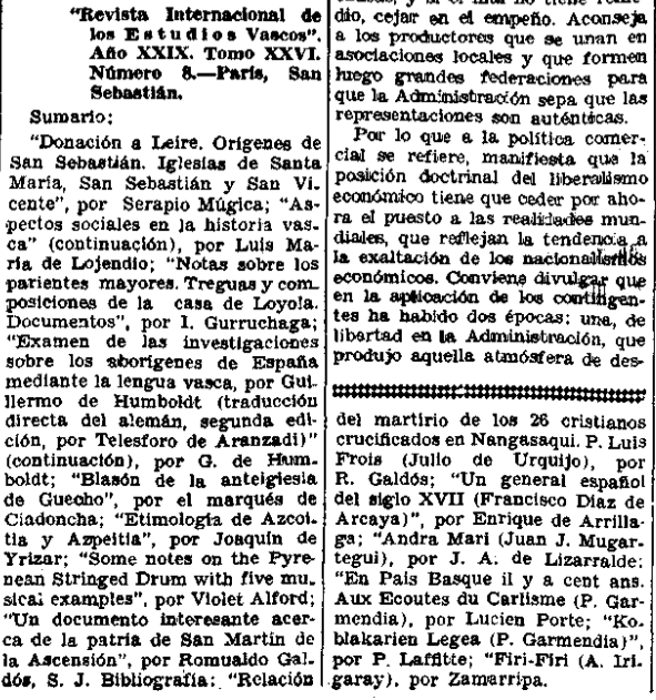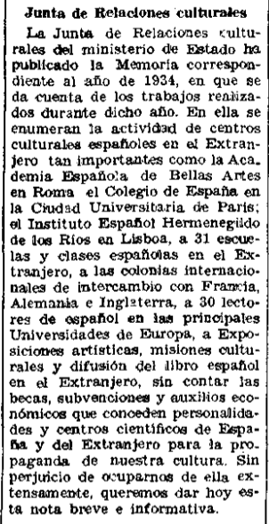 Ahora dio cobertura a las conferencias impartidas en Holanda por el iusnaturalista José Ramón de Orúe, El Sol, a su vez, informó de publicaciones que daban cuenta de esa proyección internacional de la cultura científica española como era el caso de la memoria editada por la Junta de Relaciones Culturales en la que daba cuenta de las actividades organizadas en 1934 y de la Revista internacional de estudios vascos.