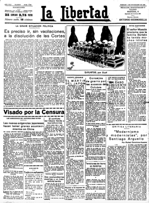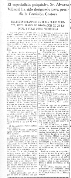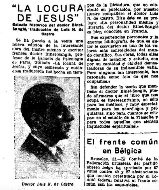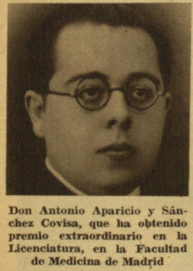 - la presencia concedida a diversos médicos por razones diversas: Ahora encomia a #AntonioAparicioySánchez-Covisa por haber obtenido el premio extraordinario de Licenciatura en sus estudios en la Facultad de Medicina. Meses después será un notable cirujano del gobierno republicano, exiliándose luego en 1939 a México donde desarrollará una notable labor profesional como urólogo en Pachuca, según ha destacado Juan Carlos Paz Bautista (ver aquí). Por su parte La Libertad informa de la traducción que había hecho su colaborador el doctor Luis N. Castro de la obra del siquiatra francés Binet-Sanglé de la obra titulada La locura de Jesús. A su vez el informador en La Voz de temas municipales de Madrid escribió un texto irónico acerca de cómo se hizo cargo de la junta gestora del Ayuntamiento madrileño el médico Sergio Alvarez Rodriguez de Villamil que el periodista confunde con su hermano el siquiatra Vicente, yerno del doctor #Esquerdo, famoso siquiatra y republicano histórico. Asimismo El Liberal se hizo eco de un gran debate existente entre los médicos españoles sobre la implantación del seguro social de enfermedad, trasladando las resoluciones adoptada en un congreso pro-medico que se había celebrado en Zaragoza.