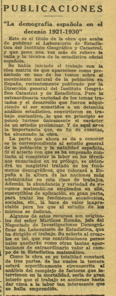 - la cobertura dada por Ahora a la publicación del libro La demografía española en el decenio 1921-1930, publicada por el #Laboratorio de #Estadística del #InstitutoGeograficoyCatastral.