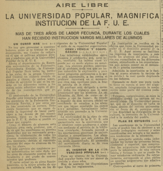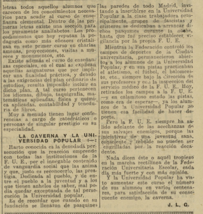 Varias de ellas aludían a los esfuerzos realizados en los años republicanos para impulsar la educación informal por iniciativas como la Universidad Popular creada por la #FUE, a la que dedicó un amplio artículo El Liberal. El Sol, a su vez, dio cuenta de las clases gratuitas que impartían los integrantes de la Asociación Profesional de #Alumnos de Caminos.