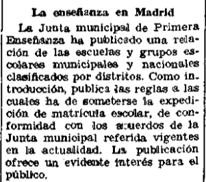 Si Ahora dedicó su sección "Vida cultural y pedagógica" a informar de diversos eventos de carácter educativo que iban a tener lugar en Madrid, El Sol dio a conocer un informe municipal sobre la situación de la enseñanza primaria en esa ciudad.