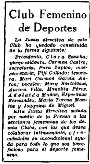 En tercer lugar resalto cómo El Sol notificó la composición de la Junta directiva del Club #Femenino de #Deportes, como prueba del importante desenvolvimiento del #deportefemenino que se produjo en los años republicanos.