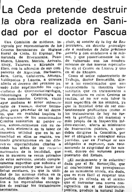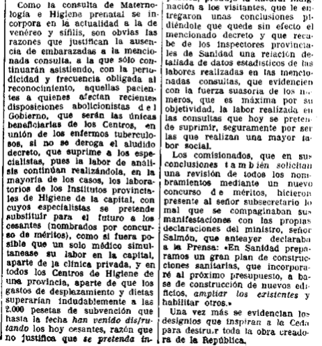 Si La Voz dio cobertura a la inauguración de una casa de socorro en el barrio madrileño de #Chamberí, por su parte La Libertad prestó atención a una denuncia de un colectivo de médicos sobre el deterioro de la situación sanitaria en diversos lugares del país por la aplicación de un decreto de julio de 1935 en centros secundarios de higiene rural.