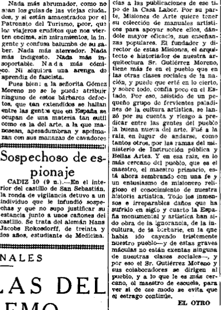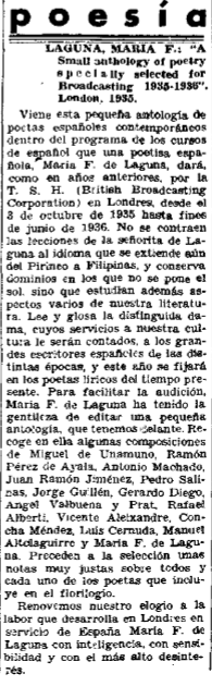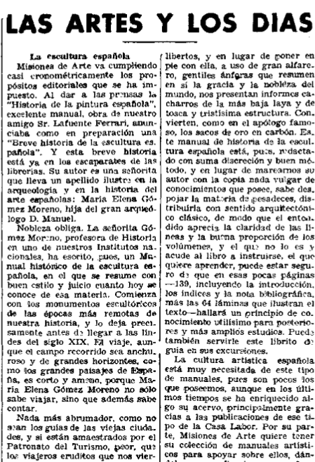 En su página cultural se presentó a #JacintoBenavente como autor del día, dado el éxito de una de sus obras teatrales en #EstadosUnidos, se encomió la labor llevada a cabo en Londres por la profesora #MariaFLaguna que daba a conocer en la radio británica a los mejores poetas españoles, se publicó un articulo de #MariaMoliner y se presentó una amplia reseña del libro que acababa de publicar la catedratica de instituto #MariaElenaGomezMoreno sobre la escultura española. Y en otra hoja del diario se informó de la ultima sesión de la #Academia española.