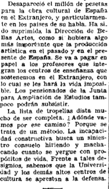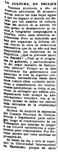 Dedicó un editorial a criticar la falta de interés gubernamental por apoyar las infraestructuras culturales y fomentar el consumo de las producciones culturales, a diferencia de la labor de los gobiernos del primer bienio republicano.
