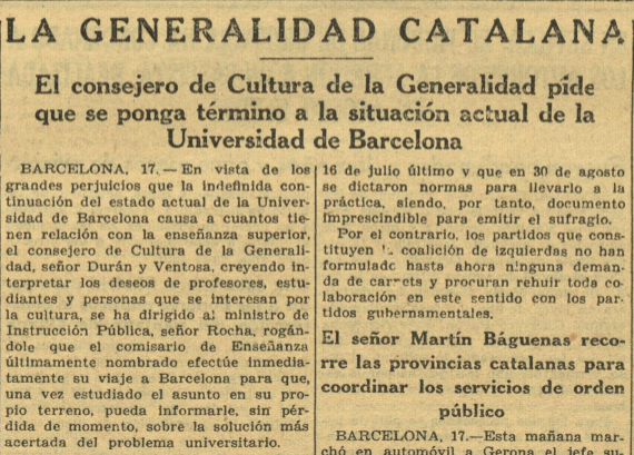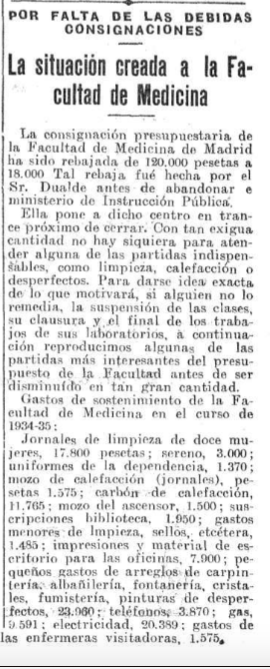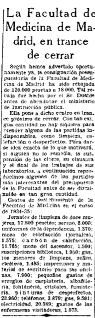 En el terreno educativo hubo noticias contradictorias. El Sol y Heraldo de Madrid informaron de las dificultades en el funcionamiento de la Facultad de Medicina de la #Universidad de #Madrid, ante la disminución de las ayudas estatales; y Ahora trasladó las quejas del consejero de Cultura de la Generalidad Catalana ante la pérdida de autonomía de la #Universidad de #Barcelona. Pero La Voz se hizo eco de la inauguración de un nuevo grupo escolar en #Barcelona gracias al mecenazgo del exalcalde #CollasoyGil, próximo a la fracción del partido liberal que había dirigido el conde de Romanones.
