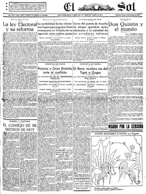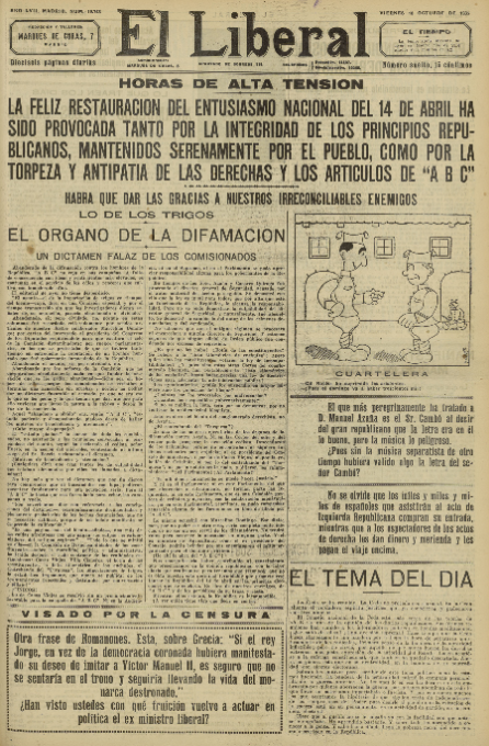 Se presentan a continuación las portadas de los seis principales diarios republicanos publicados en esa jornada. En la del diario El Sol aparecía el artículo de #JoseMorenoVilla "Don Quintín y el mundo".