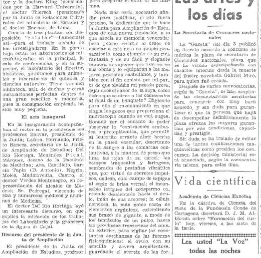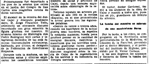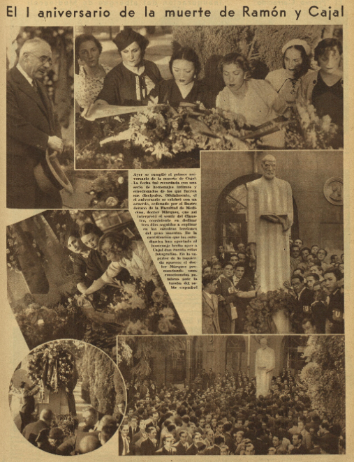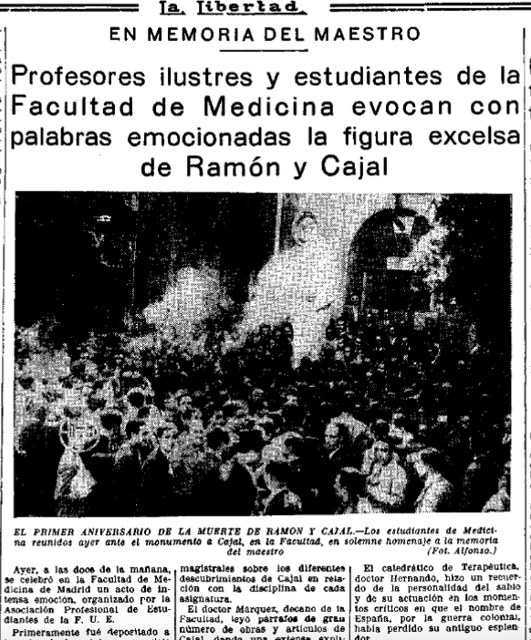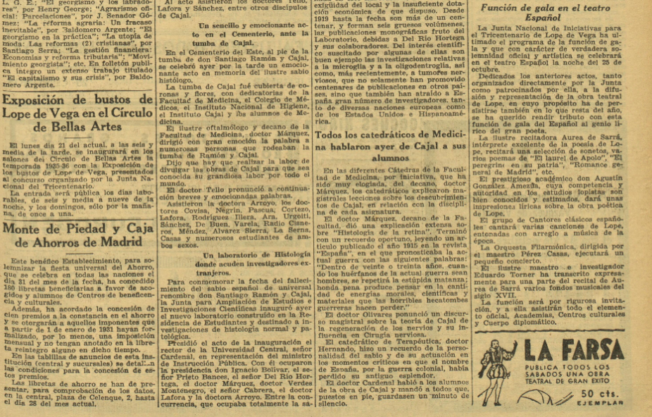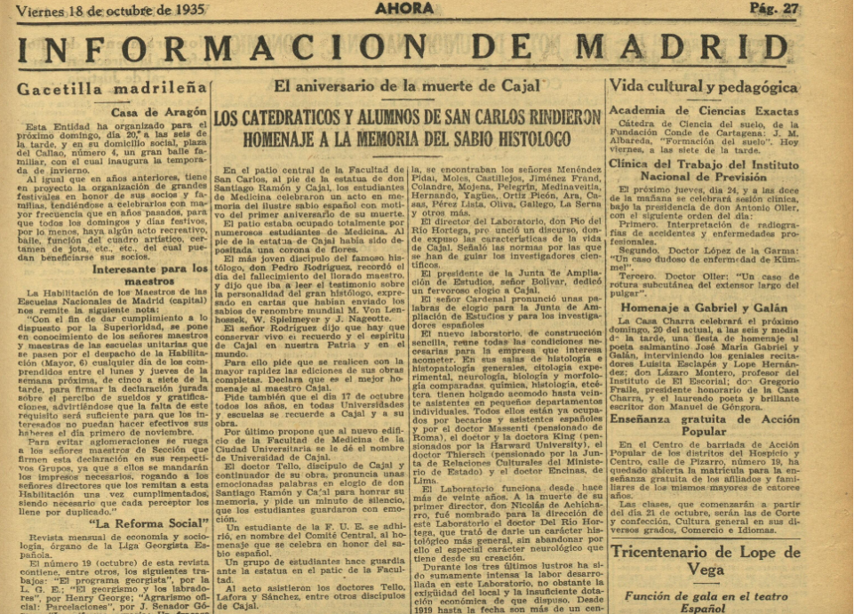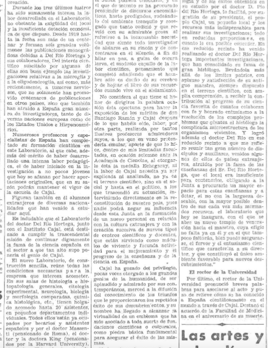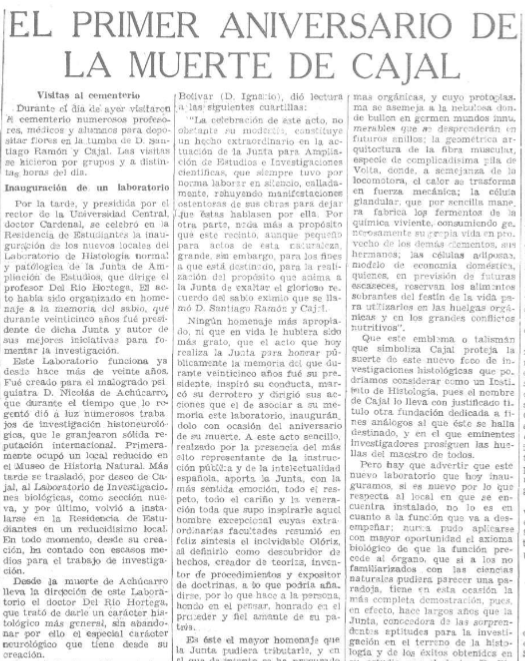 En el ámbito científico los principales diarios de la mañana de aquel día -sobre todo Ahora y El Sol- dieron amplia información sobre los actos celebrados el día anterior en la Facultad de Medicina de la Universidad de Madrid y en la Residencia de Estudiantes para homenajear a #Cajal en el primer aniversario de su fallecimiento. Ahora destacó por su cobertura gráfica y El Sol por los detalles que ofreció del evento celebrado la tarde anterior al inaugurarse la tarde anterior en la Residencia de Estudiantes el nuevo laboratorio de #PiodelRioHortega, uno de los discípulos de #Cajal más aventajados.