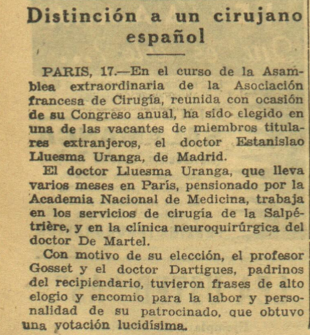 El diario Ahora, por ejemplo, se hizo eco de la distinción obtenida en #Paris por el joven doctor #EstanislaoLluesmaUranga, que fallecería en su exilio en Buenos Aires en 1968, según evoca su hijo en una breve semblanza accesible aquí.