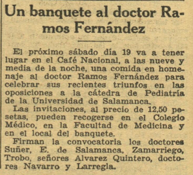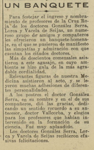 Tanto Ahora como El Liberal dieron noticia de varios banquetes organizados para homenajear a médicos diversos, como el pediatra #RafaelRamosFernandez,discipulo de #EnriqueSuñer, que habían obtenido éxitos profesionales y que son un indicador de la intensidad de la sociabilidad de los médicos de aquella época.