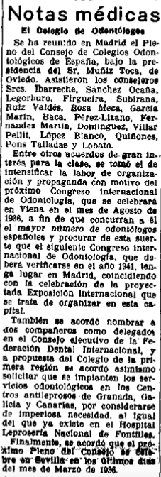 La Libertad se hizo eco del deseo del Consejo de Colegios Odontológicos de España de presentar la candidatura de Madrid para celebrar el Congreso Internacional de Odontología de 1941, posterior al que había de celebrarse en Viena en agosto de 1936.