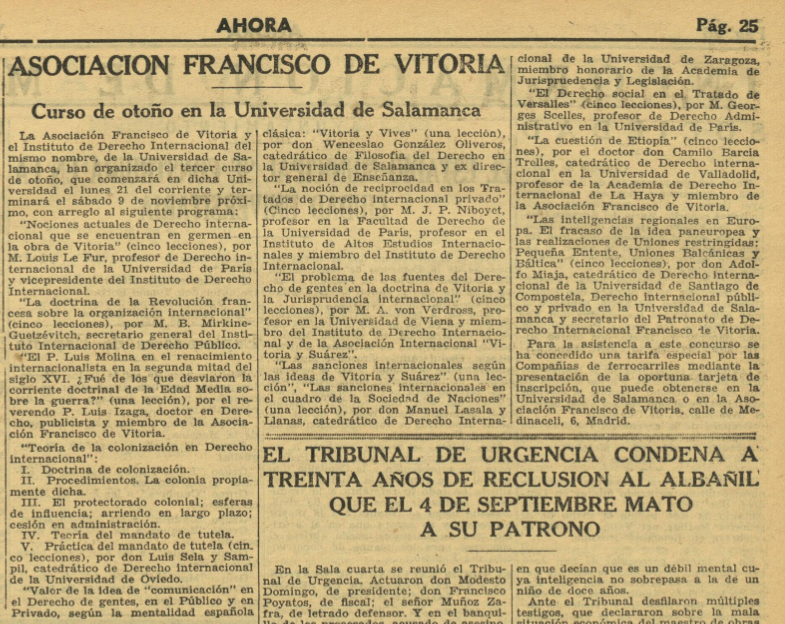Por su parte Ahora también dio noticia de un curso que la Asociación Francisco de Vitoria dedicada a estimular los estudios de Derecho internacional había organizado en la #Universidad de #Salamanca.