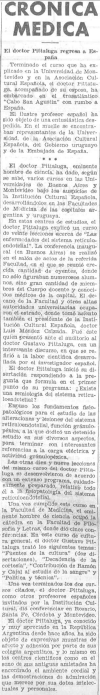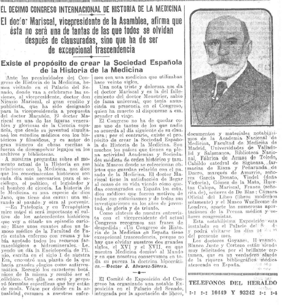 En la información científica que ofrecen esos diarios en esa jornada sobresale la entrevista que hizo el colaborador de Heraldo de Madrid, el doctor #JAlvarezSierra al vicepresidente del #XCongresoInternacionaldeHistoriadelaMedicina el doctor #NicasioMariscal y la cobertura proporcionada por el diario El Sol a las conferencias impartidas en #BuenosAires por el doctor #Pittaluga en el viaje que acababa de hacer a tierras sudamericanas. Ese diario también dedicó sus editoriales a criticar la nueva composición del #ConsejoNacionaldeSanidad y las medidas adoptadas por el #AyuntamientodeMadrid para mejorar la #higiene de la ciudad.
