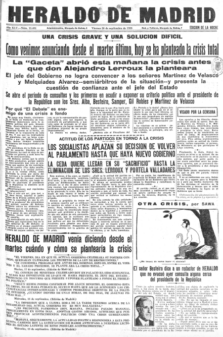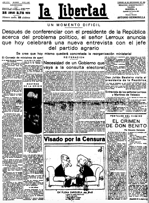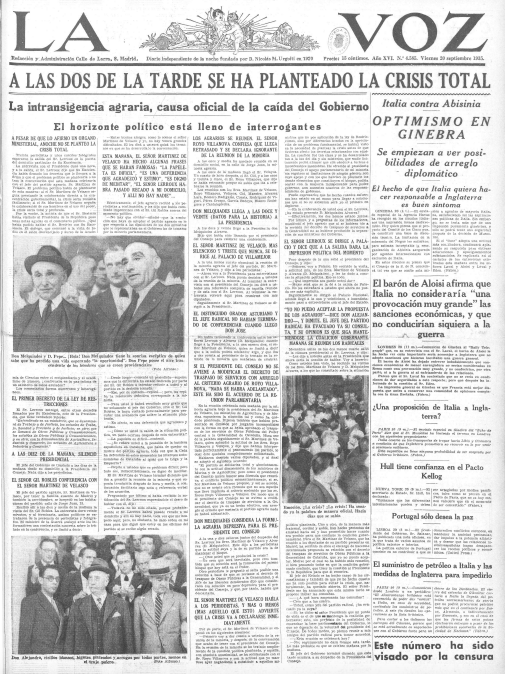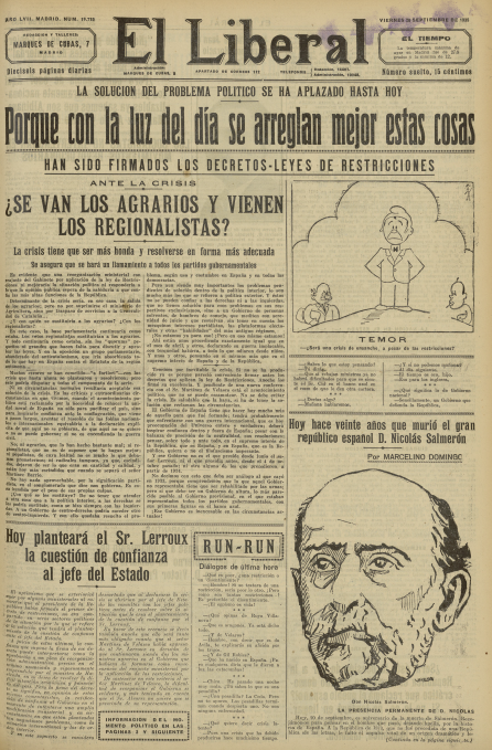 Se presentan a continuación las portadas de seis diarios editados en Madrid en ese día. Cuatro eran matutinos: #Ahora, #ElSol, #LaLibertad, #ElLiberal. Los otros dos, vespertinos: #HeraldodeMadrid y #LaVoz.