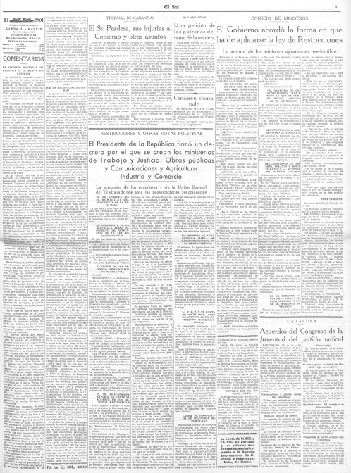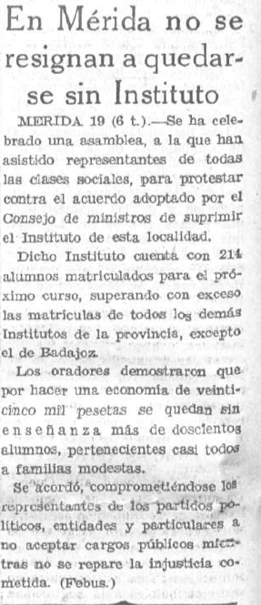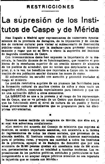 En el ámbito educativo diversos diarios, como El Sol, La Libertad, El Liberal informaron de las iniciativas adoptadas en diversas ciudades como #Mérida y #Caspe para evitar la supresión de sus institutos locales al aplicárseles la ley de Restricciones.