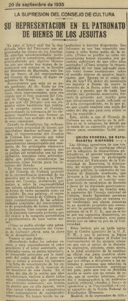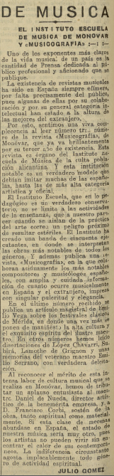 El Liberal también publicó un artículo de su colaborador #JulioGómez sobre el #InstitutoEscueladeMúsica de #Monóvar y la revista #Musicografía. Y al igual que hacía en un editorial El Sol publicaba un artículo denunciando la supresión del #ConsejoNacionaldeCultura y elogiando la labor supervisora de #Vinós en el Patronato de administración de los bienes de los #jesuitas, fiscalización que el articulista asociaba a la supresión de ese organismo asesor de la política educativa. Y ese mismo diario solicitaba la gratuidad para los alumnos que se inscribiesen en la escuela preparatoria del #InstitutoSanIsidro.