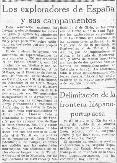 el suelto de El Sol sobre los campamentos organizados en ese verano de 1935 por los #exploradoresdeEspaña y la información ofrecida por ese diario por los trabajos que se estaban realizando en tierras gallegas para la delimitación de la frontera hispano-portuguesa.