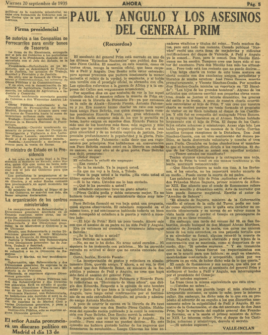 un artículo en Ahora de #ValleInclán, que fallecería pocas semanas después, sobre el asesinato del general #Prim