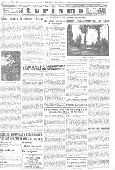 la página dedicada por Heraldo de Madrid al turismo con un artículo de #AGarcíaGuzmán sobre #Cuenca, "asombro de geólogos y turistas", otro sobre la ciudad de #Soria, publicidad de un viaje a #Rusia organizado por ese diario y la denuncia de la inoperancia del #PatronatoNacionaldeTurismo a propósito de la falta de publicidad ante la proeza de haber construido en #SierraNevada la carretera más alta de Europa.
