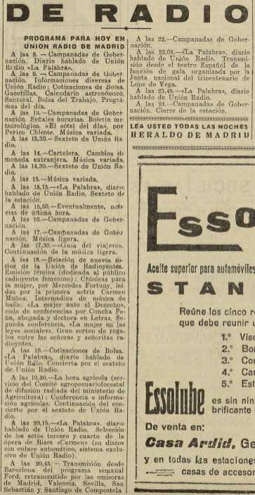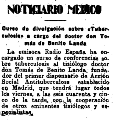 La #radio era usada por científicos e ingenieros para transmitir sus conocimientos, bien en la emisora Radio España como haría el doctor #TomásdeBenitoLanda con un grupo de colaboradores que le ayudaron a organizar un curso de divulgación sobre la tuberculosis, según un anuncio de Heraldo de Madrid o la abogada y doctora en Letras Concha Peña que daría ese día su charla hacia las 18,30 horas sobre "La mujer en las leyes sociales", la segunda del ciclo "La mujer ante el Derecho", o los responsables de "La hora agrícola" a partir de las 19,30 horas en las ondas de Unión Radio, según la programación que difundió El Liberal.