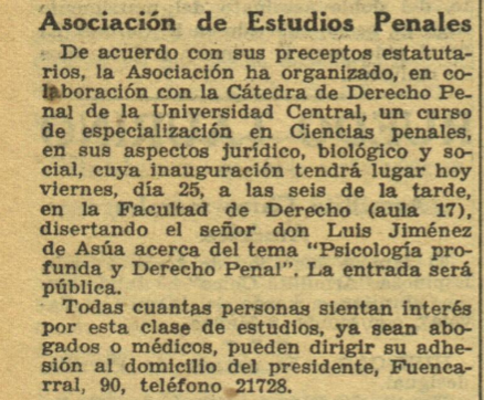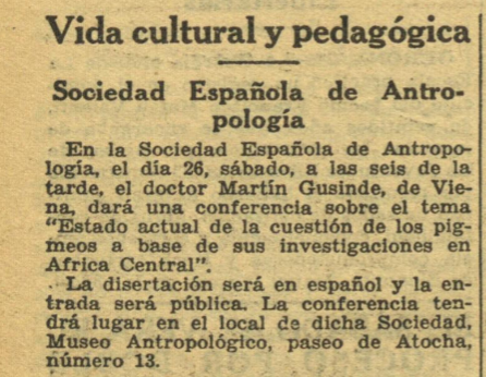 En cuanto a las ciencias sociales y humanas tanto Ahora como El Liberal se hicieron eco de la conferencia que iba a impartir el antropólogo austríaco #MartinGusinde en la sede la de la sociedad española de antropología, etnografía y prehistoria. Y Ahora también informó de un curso de especialización que había organizado la asociación de estudios penales, vinculada a la cátedra de Derecho Penal que tenia #LuisJimenezdeAsúa en la Universidad de Madid.