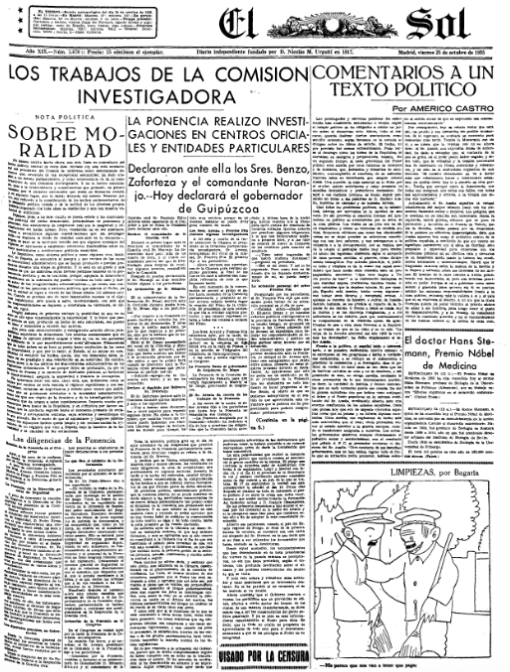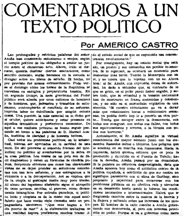 La primera plana del diario El Sol insertaba un artículo de #AméricoCastro en el que hacía una valoración del discurso pronunciado el domingo anterior por #ManuelAzaña en el campo de Comillas a orillas del madrileño puente de Toledo. Por su interés lo inserto tras las mencionadas portadas.