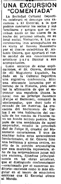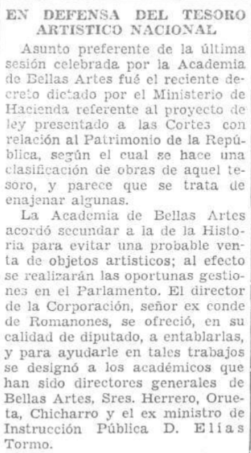 La Voz se hizo eco de resoluciones adoptadas en la Academia de Bellas Artes de San Fernando tendentes a proteger el tesoro artístico de la nación. La Libertad dio cobertura a una conferencia que había impartido en la Sociedad Cultural Deportiva el pedagogo #AntonioJOnieva sobre "El #Escorial". El crítico de arte de Ahora #LuisGilFillol hizo un balance de la pintura de #paisaje presente en el XV Salón de Otoño. Y La Voz dio cobertura al recital que había dado en Madrid en el Casal de Catalunya la guitarrista catalana #RosaLloretOrtiz.