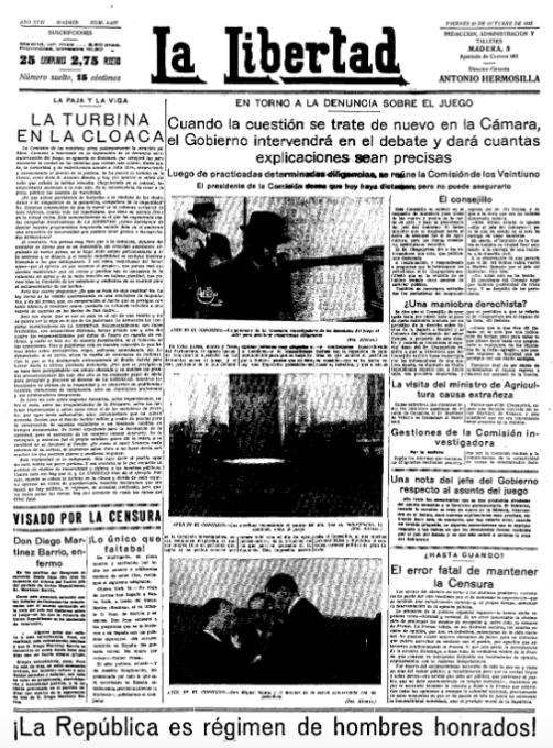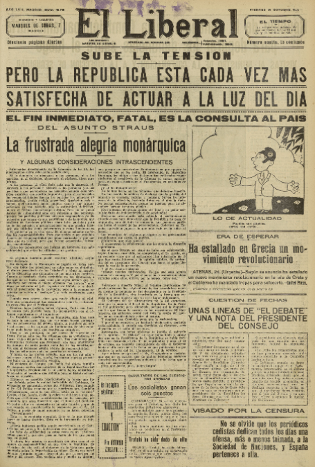 Se presentan a continuación las portadas de los seis principales diarios republicanos que se publicaron en Madrid en aquella jornada, en la que la atención política estaba concentrada en las deliberaciones de una comisión investigadora de diputados del dossier que implicaba al círculo íntimo del líder del partido republicano radical, Alejandro Lerroux, en un caso de corrupción: el conocido como "asunto Strauss".