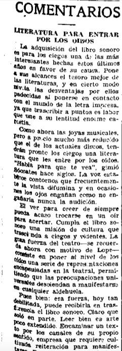 En el terreno educativo El Sol dedicó uno de sus editoriales, titulado "Literatura para entrar por los oídos" a elogiar una iniciativa tendente a favorecer la educación informal de las personas con discapacidad visual, mediante la elaboración de audiolibros. El editorialista aprovecha la ocasión para elogiar la creación del Museo de la Palabra por el Centro de Estudios Históricos de la #JAE.
