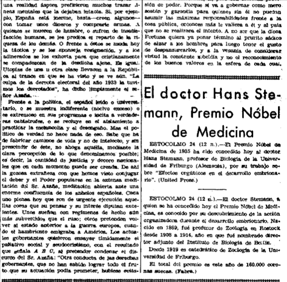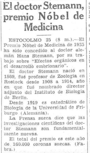 Respecto a las ciencias de la salud varios periódicos como El Sol, en su primera plana, y La Voz dieron cuenta de la concesión del premio Nobel de Medicina al investigador alemán #HansStemann, que era catedrático de Biología de la universidad alemana de Friburgo. Y Ahora insertó una fotografía de un acto de homenaje a #Cajal en el que intervino su discípulo #PiodelRioHortega.