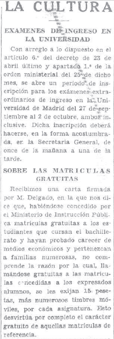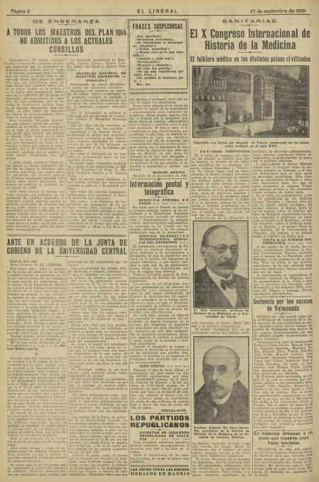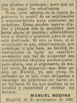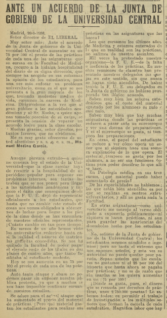 El Liberal publicó una carta del estudiante #ManuelMedina, fechada en Madrid el 26 de septiembre de 1935, en la que se criticaba el incremento de las tasas que habían de pagar los estudiantes de Medicina de la Universidad Central para hacer sus prácticas.