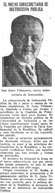 Heraldo de Madrid insertaba un suelto en el que elogiaba al nuevo subsecretario de Instrucción Pública #JustoVillanueva, catedrático de Derecho Político de la #Universidad de #Valladolid.