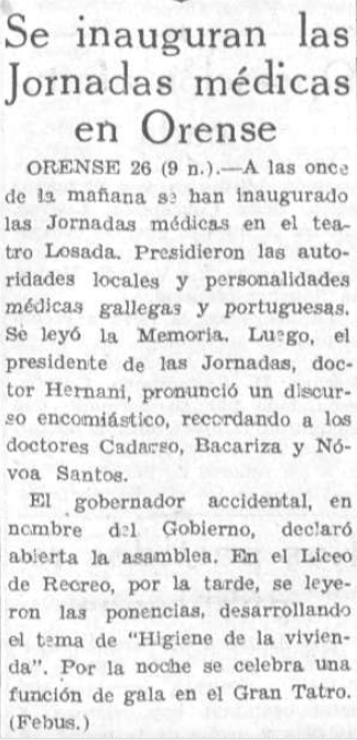 Ese mismo diario ofreció otras noticias sobre cuestiones médicas como la ida a Estados Unidos de los doctores #Socker y #Blanco, representando al gobierno español en un #congreso de #cirujía y la inauguración de unas jornadas médicas en #Orense. También dedicó uno de sus editoriales a valorar la lotería sanitaria del 11 de octubre próximo.